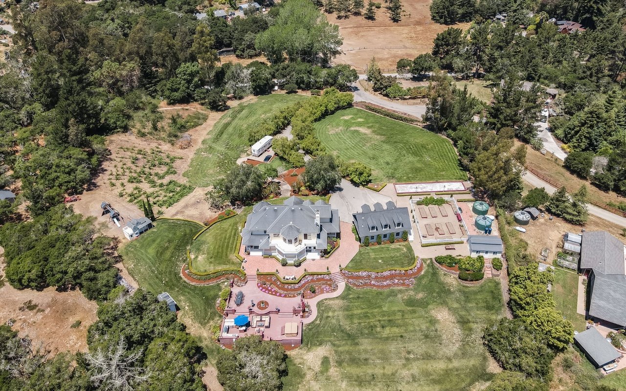 THE PALOMINO ESTATE! This iconic, luxury 4 bedroom, 3.5 bath + full executive office home sits on 5.5 lush acres & features a pinot noir vineyard, dramatic tree-lined driveway entrance, 3 car detached garage & a dream-inspired outdoor entertaining area. Hardwood floors, open floor plan, sunshine in every room make this stunning, gated estate a wonderful place to live & entertain. Gourmet kitchen w/ high-end appliances, formal & casual dining areas, open great room, formal living room, ground floor bedroom w/ full bath & mudroom/laundry room make up the elegant downstairs 2nd floor boasts an extra large Master Suite w/ a sitting room, walk-in closet, & adjoining marble bathroom featuring dual sinks, a claw foot tub, dual head oversized shower & chandelier lighting. Captivating views for miles. Bocce court, raised garden beds, charming full-sized kids playhouse, outdoor bathroom, classic brick patio w/ surround sound, full kitchen & hot tub. The list goes on! A+ Aptos Hills property!